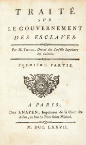 PETIT (Émilien) - Traité sur le gouvernement des esclaves. Paris : Knapen, 1777. — 2 volumes in-8, 192 x 122 : (1 f.), iv, 466 pp. ; (1 f.), 330 pp., (1 f.).