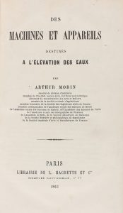 1863-1873. LIBRO: (ARQUITECTURA-INGENIERÍA). MORIN, ARTHUR; V. CH. JOLY: DES MACHINES ET APPAREILS DESTINÉS A L´ÉLÉVATION DES EAUX. Paris: Libr. L. Hachette et Cie, 1863. 8º mayor. 2 h. + 323 p. + 9 lám. grabadas....