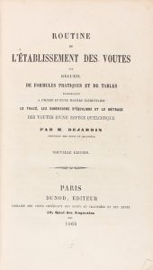 1865. LIBRO: (ARQUITECTURA). DEJARDIN. ROUTINE DE L´ÉTABLISSEMENT DES VOUTES ou recueil de formules practiques... Paris: Ed. Dunod, 1865. 8º mayor. 304 p. Ilustr. con 6 lám. plegadas. Amplios márgenes. Enc. en media...