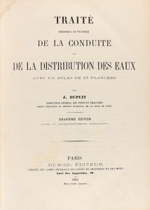 1865. LIBRO: (ARQUITECTURA). DUPUIT, JULES.: TRAITÉ THÉORIQUE ET PRATIQUE DE LA CONDUITE ET DE LA DISTRIBUTION DES EAUX AVEC UN ATLAS DE 47 PLANCHES. COMPLETO. Paris: Imp. E. Thunot, 1865. 2 vol. en 4º. I: XV + 496 p....