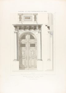 incompleta (40 lám. de un total de 100), sin encuadernar. Bellas lám. de la famosa publicación francesa con vistas, alzados, secciones y planimetrías de casas, villas y pavellones. [Más]: MAISONS PLUS REMARQUABLES DE PARIS... Id: Caudrilier, 1880 ca. Folio mayor. 65 lám. de 80 presentadas en carpeta original con la lomera en tela. Bellas láminas dibujadas por Vacquer de fachadas, planimetrías y secciones de edificios emblemáticos. Cercos de humedad en la mayoría de láminas.