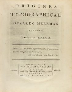 + 312 p. y 10 lám. (una de ellas doble), dibujadas por van Noorde, Fournier y Salgas, y grabadas por a. J. Polack. Amplios márgenes, bonito trabajo de edición. Dos tomos enc. en un vol. en caroné, lomera de piel, tejuelo, cantos algo rozados. Meerman investigó el origen de la tipografía y para documentarse viajó por Europa y sostenía la teoría de que el inventor de la imprenta de tipos móviles fue Laurens Coster; a pesar de este dato su investigación es excelente y sus descripciones muy apreciadas, como las ilustraciones que acompañan la obra.