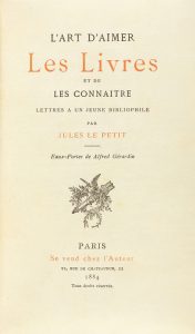 1884. LIBRO: (BIBLIOFILIA). LE PETIT, JULES: L´ART D´AIMER LES LIVRES ET DE LES CONNAITRE LETTRES A UN JEUNE BIBLIOPHILE. Paris: Chez l´auteur, 1884. 8º mayor. 196 p. + 1 h. Ilustr. con cabeceras, culs-de-lamp y 2...