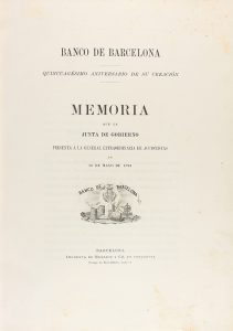 fotografía del Banco de Henrich y Cía., y 4 láms. com con facsímiles de billetes de las emisiones hechas por el Banco. Enc. en pergamino ilustrado, corte superior dorado, planos y portada algo sucios. Edición en papel de hilo. Palau 23182. Memoria publicada con motivo del quincuagésimo aniversario de la fundación del Banco de Barcelona´.