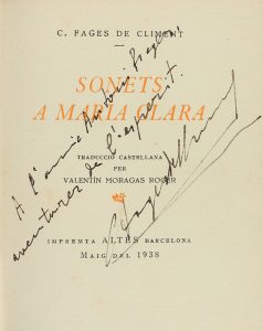 1938. LIBRO: (BIBLIOFILIA). FAGES DE CLIMENT, CARLES: SONETS A MARIA CLARA. Traducció castellana per Valentín Moragas Roger. Barcelona: Imp. Altés, 1938. 55 p. + 2 h. Texto bilingüe enfentados en castellano y catalán....