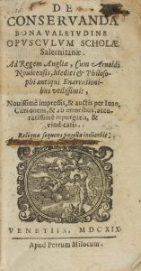 1619. LIBRO: (MEDICINA). [VILANOVA], ARNAU: DE CONSERVANDA BONA VALETUDINE OPUSCULUM SCHOLAE SALERNITANAE. Venetiis: Apud Petrum Milocum, 1619. 16º. 12 h. + 271 p. + 4 p. Portada con xilografía tipográfica. Texto con...