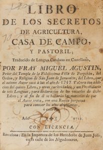 1722. LIBRO: (AGRICULTURA). AGUSTIN, MIGUEL: LIBRO DE LOS SECRETOS DE AGRICULTURA, CASA DE CAMPO, Y PASTORIL. Traducido de Lengua Catalana en Castellano por... Libro que el mismo autor sacó a la luz en 1717. Y ahora con...