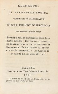 1821. LIBRO: (MATEMÁTICAS). DESTRUTT- TRACY: ELEMENTOS DE VERDADERA LÓGICA. COMPENDIO Ó SEA ESTRACTO DE LOS ELEMENTOS DE IDEOLOGIA. Madrid: Imp. de Mateo Repullés, 1821. 8º. XX. + 365 p. Puntos de óxido. Enc. pasta...
