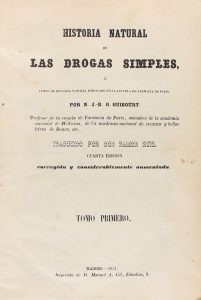 1851. LIBRO: (MEDICINA). GUIBOURT, N. J.- B. G.: HISTORIA NATURAL DE LAS DROGAS SIMPLES, Ó CURSO DE HISTORIA NATURAL ESPLICADO EN LA ESCUELA DE FARMACIA DE PARIS. Traducción de Ramón Ruiz. Madrid: Imp. D. Manuel A. Gil,...