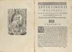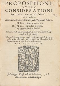 1588. LIBRO: (POLÍTICA). GUICCIARDINO, FRANCESCO: PROPOSITIONI OVERO CONSIDERATIONI IN MATERIA DI COSE DI STATO, SOTTO TITOLO DI AVVERTIMENTI, AVVEDIMENTE CIVILI & CONCETTI POLITICI. Vinegia: presso Altobello Salicato,...
