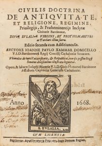 1668. LIBRO: (POLÍTICA). XAMMAR, IOANNE PAULO: CIVILIS DOCTRINA DE ANTIQUITATE, ET RELIGIONE, REGIMINE... Barcinona: Apud Iospheum Forcada, 1668. 8º mayor. 325 p., 120 p. aprox. Grabado xilográfico de Santa Eulalia en...