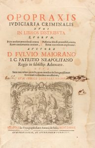 1677. LIBRO: (DERECHO). MAIORANO, FULVIO: OPOPRAXIS IUDICIARIA CRIMINALIS. DUOS IN LIBROS DISTRIBUTA. Neapoli: typ. Lucae Antonii de Fusco, 1677. Folio menor. 6 h. + 264 p. + 16 h. Texto a dos columnas. Bonitas cabeceras y...