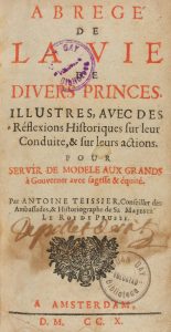1710. LIBRO: (POLÍTICA). TEISSIER, ANTOINE: ABREGÉ DE LA VIE DE DIVERS PRINCES. ILLUSTRES AVEC DES... Amsterdam: S. Imp., 1710. 8º menor. 341 p. Portada a dos tintas con grabado tipográfico. Antiguo cerco de humedad en...