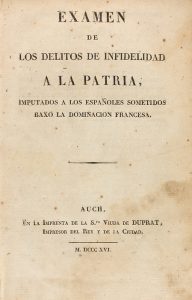 1816. LIBRO: (DERECHO-HISTORIA). [REINOSO, FÉLIX JOSÉ:]. EXAMEN DE LOS DELITOS DE INFIDELIDAD A LA PATRIA, IMPUTADOS A LOS ESPAÑOLES SOMETIDOS BAXO LA DOMINACION FRANCESA. Auch: Imp. Sra. Viuda de Duprat, 1816. 8º...