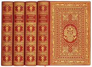 forma artística de su época la edición ilustrada por Geronymo y Juanbautista Verduffen aparecida en Amberes en 1673. El editor ha añadido 32 ilustraciones de la edición de la ´Compagnie des Libraires´ en París en 1713 y 25 ilustraciones de Ch. A. Coypel grabadas por Folkema y Fokke que figuran en la edición de Arkspée en Amsterdam en 1755. Papel verjurado con filigrana. 4 vol. enc. en piel con hierros dorados en los planos y lomeras cuajadas y corte superior dorado. Edición numerada de 1499 ejemplares.