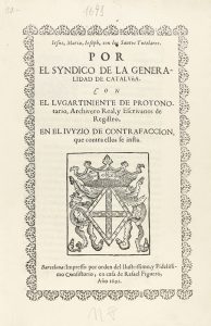 1691. FOLLETO: (BARCELONA). POR EL SYNDICO DE LA GENERALIDAD DE CATALUÑA CON EL LUGARTENIENTE DE PROTONOTARIO, ARCHIVERO REAL, Y ESCRIVANOS DE REGISTRO. EN EL JUICIO DE CONTRAFACCIÓN QUE CONTRA ELLOS SE INSTA. Barcelona: Imp....