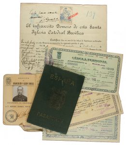 1934-1956. FOLLETO/VARIA: (GUERRA CIVIL). CONJUNTO DE 6 CARPETAS CON DOCUMENTACIÓN DE LA GUERRA CIVIL. Conjunto documental en 6 carpetas del Alférez Manuel Borras Paris: 1. Documentación variada formada por un pasaporte,...