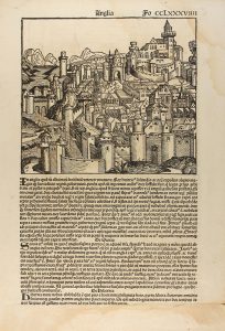 que contienen 3 grabados xilográficos de 20 x 22 cm aprox. cada uno. Presentados en paspartú. El folio LXXI: ´Quinta etas mundi´ contiene en recto 5 viñetas xilográficas y texto en latín; en verso la xilografía de Tolosa. Anotación de anterior poseedor al margen. El folio CCLXXXVIIIII incluye los grabados de Anglia en recto y de Hispania en verso, acompañados del texto en latín. Restauración del margen inferior, antiguo cerco de humedad en la punta superior derecha. Ambos forman parte del incunable ´Liber Chronicarum´; sus grabados fueron realizados por Wolgemuth, célebre grabador y maestro de Durero.