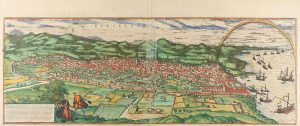 izquierda. Coloreada. Plancha; 17,2 x 51 cm. La primera edición es de Colonia, 1572. Ofrecemos un ejemplar de principios del S. XVIII sin el grabado que suele acompañarlo en la mitad inferior, que fue de Granada en las primeras impresiones y posteriormente de Écija. Papel verjurado con pequeñas restauraciones en el dorso y retoques de color en los personajes de primer plano. Cat. Soley 2.