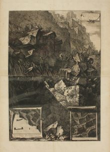 papel: 100 x 68 cm. Papel verjurado con filigrana. Bellíssimo grabado firmado (dibujado y grabado) por Piranesi, que forma parte de la serie de ´Antichitá di Cora´ (1764). El grabado está dividido en tres figuras: la central, donde se ilustra la monumental muralla ciclópea que sustenta la fortificación en su parte superior; y dos figuras a manera de cartela, donde se representan las terrazas, galerías y accesos de la construcción. Algún punto de óxido y pequeñas rasgaduras marginales.