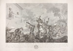 1810 ca. GRABADO: (GUERRA INDEPENDENCIA). RODRIGUEZ, ANTONIO [Dibujo]: DOS GRABADOS DE LA GUERRA DE INDEPENDENCIA: HEROISMO DE LAS AUTORIDADES DE BARCELONA EL 9 DE ABRIL DE 1808 y HEROICA RESISTENCIA DE LA VILLA DEL ARBÓS EN...