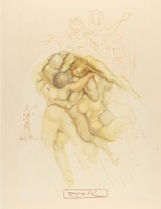 1963. GRABADO: (ARTE). DALÍ, SALVADOR: LOS IRACUNDOS. 33 x 26 cm. Presentada en paspartú. Litografía que corresponde al Canto 8 del Infierno de la Divina Comedia ilustrada por Dalí (Ed. d´Art les Heures Claires, 1963).