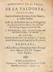 1714. LIBRO: (HERÁLDICA-AMÉRICA-NAVARRA). ELORZA Y RADA, FRANCISCO DE: NOBILIARIO DE EL VALLE DE LA VALDORBA, ILUSTRADA CON LOS ESCUDOS DE ARMAS DE SUS PALACIOS, Y CASAS NOBLES. Con el extracto de la conquista de el Ytza en...