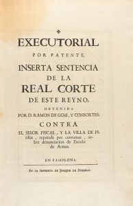 1779. LIBRO: (HERÁLDICA-DERECHO). EXCUTORIAL POR PATENTE, INSERTA SENTENCIA DE LA REAL CORTE DE ESTE REYNO, OBTENIDA POR D. RAMON DE GOÑI, Y CONSORTES: CONTRA EL SEÑOR FISCAL, Y LA VILLA DE PITILLAS, REPUTADA POR CONTUMAZ, SOBRE...