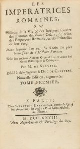 1728. LIBRO: (HISTORIA). SERVIEZ: LES IMPERATRICES ROMAINES ou Histoire de la vie & des intrigues... Paris: Chez Sebastien Ravenel, 1728. 3 vol. en 8º. I: 4 h. + 455 p. + 1 h. II: 8 h. + 444 p. III: 6 h. + 403 p....