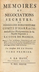 1737. LIBRO: (HISTORIA). TORRE, DE LA: MEMOIRES ET NEGOCIATIONS SECRETES DE FERDINAND BONAVENTURE COMTE D´HARRACH... À LA COUR DE MADRID, Sepuis la Paix de Riswick... La Haye: Chez Pierre Husson, 1737. 2 tomos en 1 vol....