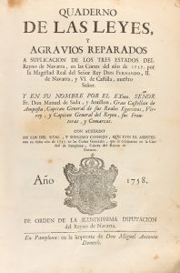 1758. LIBRO: (HISTORIA ESPAÑA). QUADERNO DE LAS LEYES, Y AGRAVIOS REPARADOS, A SUPLICACION DE LOS TRES ESTADOS DEL REYNO DE NAVARRA, EN LAS CORTES DEL AÑO 1757. Pamplona: Imprenta de Don Miguel Antonio Domech, 1758. 4º mayor....