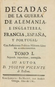 1765. LIBRO: (HISTORIA). VICENTE, JOSEPH: DECADAS DE LA GUERRA DE ALEMANIA, E INGLATERRA, FRANCIA, ESPAÑA, Y PORTUGAL. Madrid: Andrès Ortega, 1765. 9 vol. (de un total de 10) en 12º. I: 432 p. II: 311 p. Alguna galería...