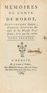 1789. LIBRO: (HISTORIA-MEMORIAS). HORDT, COMTE DE: MÉMOIRES DU COMTE DE HORDT. Berlin: Chez Briand, 1789. 8º. 2 g. + IV + 308 p. y 2 h. + 314 p. Dos tomos enc. en un vol. en pasta española, tejuelo, cortes pintados,...