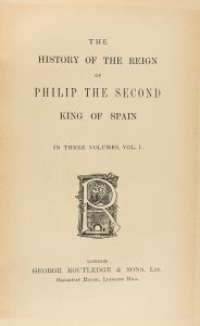 1890 ca. LIBRO: (HISTORIA). PRESCOTT, WILLIAM HICKLING: THE HISTORY OF THE REIGN OF PHILIP THE SECOND KING OF SPAIN. London: George Routledge and sons Ltd., s.a. 3 vol. en 8º mayor. I: XXIV + 523 p. Con una lám. plegada...