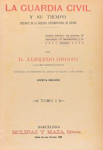1914 ca. LIBRO: (HISTORIA). OPISSO, ALFREDO: LA GUARDIA CIVIL Y SU TIEMPO, EPISODIOS DE LA HISTORIA CONTEPORÁNEA DE ESPAÑA. Barcelona: Ed. Molinas y Maza, s.a. 2 vol. en 4º. I: 606 p. (sin la portadilla) + 18 lám. y...