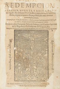 1598. LIBRO: (RELIGIÓN). HERNANDEZ BLASCO, FRANCISCO: UNIVERSAL REDEMPCION, PASSION, MUERTE Y RESURRECION DE NUESTRO REDEMPTOR IESU CHRISTO Y ANGUSTIAS DE SU SANTISSIMA MADRE. Toledo: Pedro Rodriguez, 1598. 8º mayor. 12...