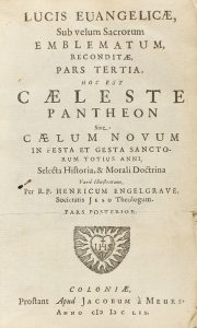 1659. LIBRO: (RELIGIÓN). ENGELGRAVE, HENRICUM: LUCIS EVANGELICAE SUB VELUM SACRORUM EMBLEMATUM RECONDITAE PARS TERTIA, HOC EST CAELESTE PANTHEON. Coloniae: Jacobum à Meurs, 1659. 8º menor. 1 h. + 645 p. + 25 p. Texto a...