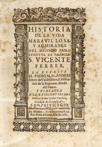 1682. LIBRO: (VALENCIA-HAGIOGRAFÍA). FERRER DE VALDECEBRO, ANDRÉS: HISTORIA DE LA VIDA MARAVILLOSA Y ADMIRABLE DEL SEGUNDO PABLO APÓSTOL DE VALENCIA S. VICENTE FERRER. Madrid: Imp. Real, 1682. 8º mayor. 12 h. + 345 p.,...