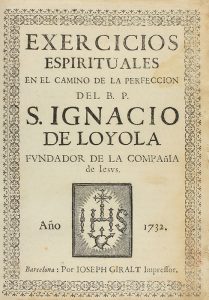1732. LIBRO: (RELIGIÓN-JESUITAS). LOYOLA, S. IGNACIO DE: EXERCICIOS ESPIRITUALES EN EL CAMINO DE LA PERFECCION DEL... Barcelona: Imp. Ioseph Giralt, 1732. 8º mayor. 1 h. + 131 p. + 1 h. Portada orlada y con el emblema de...