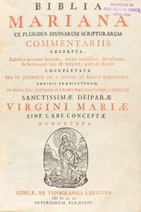 1749. LIBRO: (RELIGIÓN). BIBLIA MARIANA... Genuae: Ex Typographia Lertiana, 1749. 4º mayor, 386 p. + CV + 52 h. Portada a dos tintas con grabado xilográfico. Texto a doble columna, apostillas marginales, páginas limpias....