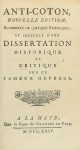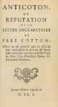 Vier, 1764. 2 vol. en 8º. I: 2 h. + 327 p. II: 2 h. + 180 p. + 60 p. + 153 p. + 1 h. [Más]: ANTI-COTON NOUVELLE EDITION...DISSERTATIONS HISTORIQUE ET CRITIQUE... Id, 1749. [Más]: ANTICOTON OU REFUTATION DE LA LETTRE DECLARATOIRE DU PERE COTTON... Id, 1610 [error en fecha]. 2 vol. enc. de cartoné, rozada, doble tejuelo. Cabeceras, culs-de-lampe. Texto con apostillas marginales, páginas limpias. Palau 248271.: ´obra de escándalo, que luego reapareció aumentada... El autor, disfrazado bajo el pseudónimo se llamaba Quesnel de Dieppe... Esta obra, que ataca a los jesuitas, fué perseguida y puesta en el índice de 1759´. Este ejemplar corresponde a la reimpresión en París.