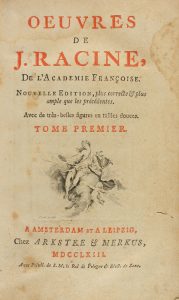 1763. LIBRO: (HUMANIDADES). RACINE:. OEUVRES DE J. RACIENE DE L´ACADEMIE FRANÇAIS. Amsterdam et Leipzig: chez Arkstee & Merkus, 1763. 3 vol. en 8º menor. I: Retrato grabado + VIII p. + 502 p. + 5 lám. II: Frontis + 512...