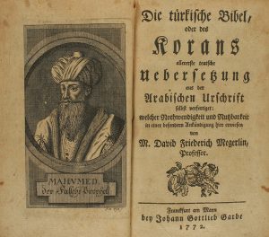 culs-de-lamp. Texto en letra gótica. Enc. en media piel, nervios. Papel algo tostado. Primera edición de la primera traducción directa del árabe al alemán del libro sagrado del Islam; las traducciones anteriores siempre partían del latín o de otras lenguas europeas. Se trata de una traducción realizada desde la visión de un cristiano protestante, por lo que, aunque es fiel al texto, en su prefacio califica al profeta Mahoma de ´falso´, igual que a su religión. El retrato grabado representa a Mahoma y a pie del mismo el texto reza ´Mahoma, el falso profeta´.