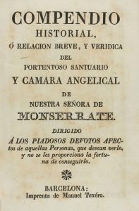 1830 ca. LIBRO: (RELIGIÓN-MONTSERRAT). COMPENDIO HISTORIAL, Ó RELACIÓN BREVE, Y VERIDICA DEL PORTENTOSO SANTUARIO Y CAMARA ANGELICAL DE NUSTRA SEÑORA DE MONTSERRATE... Barcelona: Imp. Manuel Texéro, 1830 ca. 8º. Frontis +...