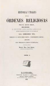 1851. LIBRO: (TRAJES-ÓRDENES RELIGIOSAS). TIRON, ABATE: HISTORIA Y TRAJES DE LAS ORDENES RELIGIOSAS... Barcelona, Doctor Martí y Artigas, 1851. 2 vol. en 4º mayor. I: 496 p. + 3 h. II: 416 p. + 150 p. + 58 lám....