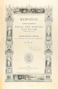 1858. LIBRO: (BIOGRAFÍA). MEMORIAL DEL ILUSTRÍSIMO Y REVERENDÍSIMO SEÑOR MANUEL MOSQUERA ASZOBISPO DE SANTAFÉ DE BOGOTÁ. Paris: Imp. Adriano le Clere y Compañía, 1858. Folio mayor. Un retrato + 2 h. + CXC p. + 5 h. Texto...