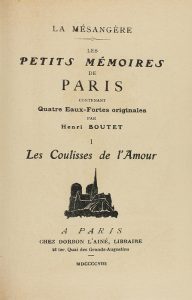 1908. LIBRO: (HUMANIDADES). BOUTET, HENRI: PETITS MÉMOIRES DE PARIS. 6 VOL. Paris: Libr. Dorbon L´ainé, 1908. 6 vol. en 12º. I: 125 p. + 1 h. + 4 lám. II: 125 p. + 1 h. + 4 lám. III: 126 p. + 1 h. + 4 lám. IV: 119...