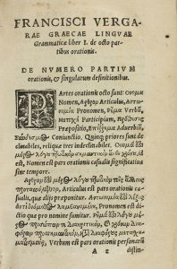 [1552]. LIBRO: (GRAMÁTICA GRIEGA). VERGARA, FRANCISCO: [FRANCISCI VERGARAE DE OMNIBUS GRAECAR LINGUAE GRAMATICAE PARTIBUS, LIBRI QUINQUE; IN SUUM & UERUM ORDINEM RESTITUTI]. [Coloniae: Walter Fabritius, 1552]. 8º. 366 p....