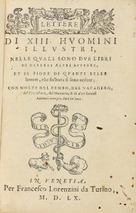 1560. LIBRO: (LITERATURA). LETTERE DI XIII HUOMINI ILLUSTRI. Venetia: Francesco Lorenzini da Turino, 1560. 8º menor. 12 h. + 768 p. Finos taladros marginales. Enc. en pergamino, sorte superior jaspeado. Contiene cartas de...