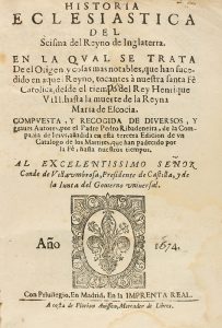 1674. LIBRO: (HISTORIA- INGLATERRA). RIBADENEIRA, PEDRO, ET ALIA: HISTORIA ECLESIASTICA DEL SCISMA DEL REYNO DE INGLATERRA. Madrid: Imp. Real, 1674. 8º mayor. 12 h. + 564 p. Texto a dos columnas, con apostillas marginales...